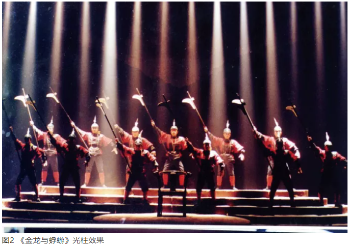 例如,在征戰這場戲中,選用16臺par燈,放在舞臺后區,根據打擊樂的節奏,借助煙霧,與演員動作緊密結合之后,在空間形成16道光柱,以寫意和抽象的方式表達征戰的勝利(圖2)?,F在看來,16臺par燈,太少了。但在那個年代,整場演出用燈超過60臺,就算是大制作。如果16臺par燈僅用一次,作為特殊效果燈而存在,那不是太少,而是太多了。一方面,由于當時條件受限,每一臺燈都需要爬大約8 m高梯子對光,非常危險;另一方面,燈光設計具有繪畫能力、造型能力,每一組燈都是在特定場景中布置的特殊效果燈,都是為了某個特定場景而存在,所以每一臺燈或每一組燈,都有非常明確的使用目的。筆者這代人在燈光設計過程中,受到的是特殊效果燈的訓練。如果要使特殊效果燈起作用,必須精讀文本,且要在排練場看彩排,深入了解導演所有的場面調度和處理。只有這樣,燈光設計才能做到心中有數,才敢用一個燈投射下去,并把規定情境的思想情感與形式美感表達出來。