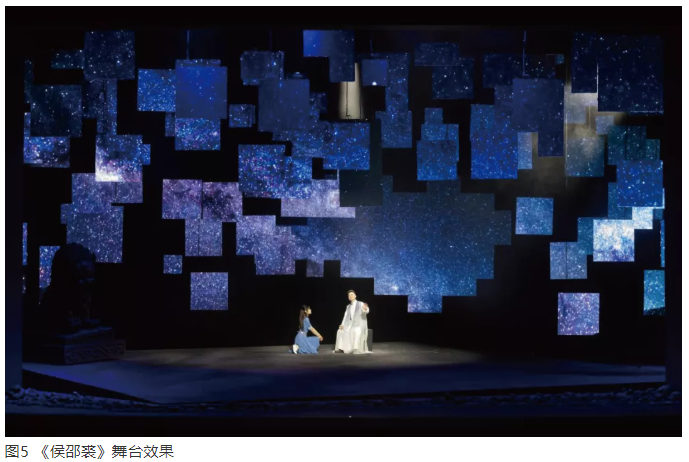 在劇本解讀后,主創團隊提煉了16個字“瘡痍大地”“迷霧漫漫”“流星飛逝”“光耀千秋”,作為形象創作的出發點。為了創造“瘡痍大地”“迷霧漫漫”“流星飛逝”的效果,舞美做了大膽嘗試。地面上是一塊傾斜的腐蝕的鋼板,周圍有一些碎石。傾斜的臺面、腐蝕的鋼板,暗喻滿目瘡痍、風雨飄搖的中華大地。在舞臺空間采用13道吊桿,每道吊桿都參差懸掛大小不等的一塊塊LED屏,在空間吊掛不同層次的LED小屏,帶有裝置藝術的意味和觀念,充滿一種意象和現代感(圖5)。由于這些LED屏幕組塊在空中吊掛的高度、縱深不同,以至于所有的完整形象投射到這個屏幕之后,都會產生支離破碎的不完整之感,以此來表達主創團隊對劇本形象的開掘。讓人物性格精神的成長生活在特定的空間環境中,是戲劇震撼人心的必要前提。所以,沒有設計描繪性的動作環境空間,而是提煉出一個隱喻和象征性的空間,運用局部的破碎形象暗示劇情的環境。