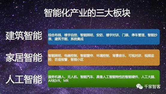 千家智客認(rèn)為,當(dāng)今的智能化產(chǎn)業(yè)應(yīng)該包含了建筑智能、家居智能、人工智能三大板塊,其中建筑智能又指智慧建筑,包括綜合布線、樓宇自控、智能照明、安防、樓宇對講、門禁、停車管理、智能抄表、建筑節(jié)能、IBMS、系統(tǒng)集成等;家居智能即智能家居,涉及智能照明、電器控制、智能窗簾、環(huán)境控制、背景音樂、可視對講、視頻監(jiān)控、防盜報警、智慧社區(qū)/智能小區(qū)等;人工智能包括服務(wù)機(jī)器人、無人機(jī)、智能汽車、具備人工智能特性的智能硬件、人工大腦、AR和VR、MR等。