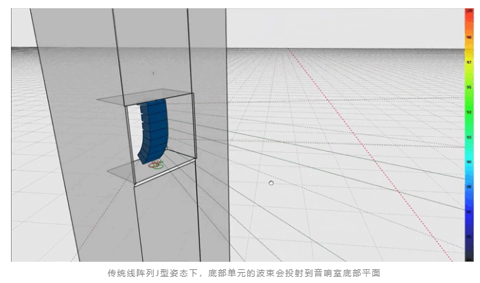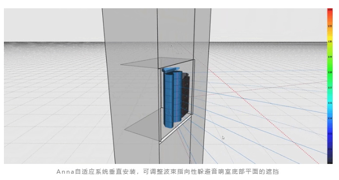 在暗裝的方式下音響室空間通常狹小緊湊。在本項目中,音響室的底部平面距離陣列僅10厘米。如果采用傳統線陣列的擴聲系統,陣列會形成J字型物理姿態,不僅占用較大的安裝空間,J型底部的音箱單元還有可能將聲能投射到音響室的底部平面上,導致大部分高頻能量無法穿透出來,從而無法覆蓋到一部分前區的觀眾區。選用Anna,它的垂直吊裝方式既能節約了安裝空間,還能將高中低頻單元統一的盡可能靠近透聲幕,躲避音響室底部平面對波束的遮擋,最終實現幾乎全場的覆蓋。