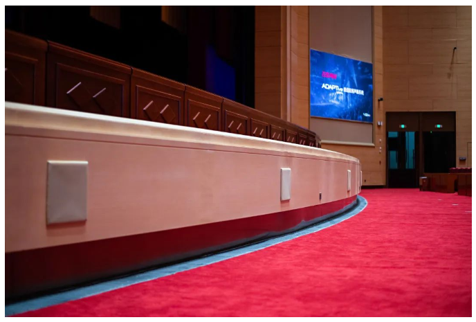 舞臺臺唇固定安裝了多只CMI5,為觀眾席前排座席補充中高頻響應。CMI5是采用同軸設計的超緊湊兩分頻揚聲器,可以提供優秀的指向性控制和均勻一致的聽音體驗。針對安裝位置過高,而造成的兩側主擴揚聲器覆蓋不足的情況,在左右八字墻大屏下方位置,固定暗藏了MKD896點聲源揚聲器予以補充。