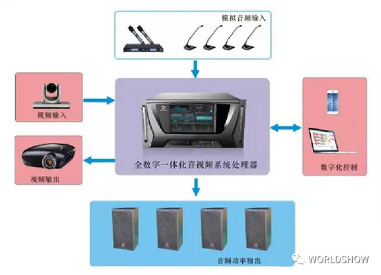 在第一代和第二代音頻架構(gòu)中一般都需要配置的調(diào)音臺的功效非常強大,有時甚至強大到非專業(yè)人士無法操作的“牽一發(fā)而動全身”的境地。同時,隨著社會化的發(fā)展,人力成本的提升,專門的“音響師”崗位無法滿足社會的需求。同時,討論型會議室的大量出現(xiàn),調(diào)音臺的作用無法滿足其現(xiàn)場操作的需求。同時,復(fù)雜的模擬連接方案也不適應(yīng)現(xiàn)在會議系統(tǒng)的需求。因此,出現(xiàn)了全數(shù)字架構(gòu)的音頻矩陣技術(shù)。從話筒輸入,到最后全部處理完成的音頻信號輸出,全部音頻信號的處理、復(fù)制、傳輸?shù)拳h(huán)節(jié)都在一臺或多臺數(shù)字設(shè)備的數(shù)字技術(shù)內(nèi)完成,僅有一次AD/DA轉(zhuǎn)換,因此稱之為第三代音頻架構(gòu):全數(shù)字化架構(gòu)。特別是全開放結(jié)構(gòu)的數(shù)字化產(chǎn)品,系統(tǒng)的核心價值已經(jīng)由完全的硬件采購部分轉(zhuǎn)移到了軟件拓?fù)涞亩伍_發(fā)上。編程開發(fā)人員的水平重要性已經(jīng)超越了設(shè)備的價值。當(dāng)然,所帶來的缺陷是現(xiàn)場操作的臨場手感沒有了。不過也不算可惜,現(xiàn)在的會議環(huán)境已經(jīng)不需要音響師現(xiàn)場調(diào)音了。