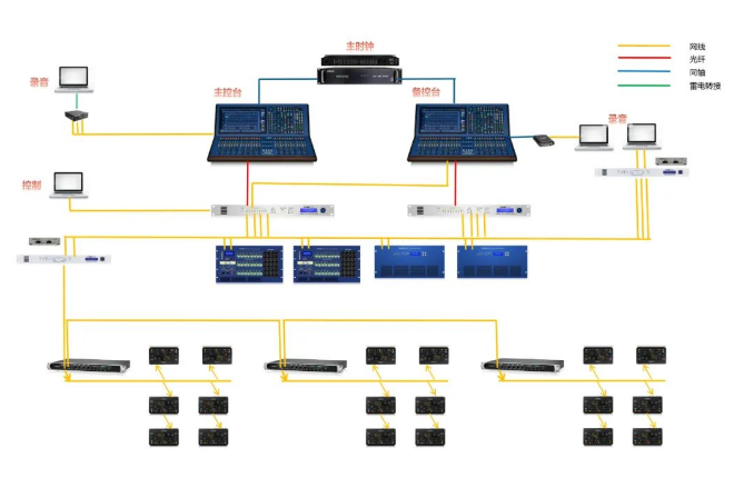 主要由2臺MIDAS DL431(音分式接口箱)和2臺MIDAS DL231(音分式接口箱)作為輸入信號集中式分配,接口箱本地24個輸入接口,將信號以一分三,拋給主控調(diào)音臺和備份調(diào)音臺。本次系統(tǒng)的備份以兩個形式進(jìn)行備份,整個系統(tǒng)的主時鐘(Master)由段濤老師帶來的超高精度外置原子時鐘擔(dān)任,兩張HD96-24調(diào)音臺為跟隨時鐘(Slave)。