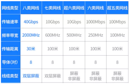 這里有必要提下八類網線,跟七類網線一樣的是雙層屏蔽(SFTP),它擁有兩個導線對,2000MHz的超高寬屏,傳輸速率高達40Gb/s,但它最大傳輸距離僅有30m,故一般用于短距離數據中心的服務器、交換機、配線架以及其他設備的連接。雖然八類線傳輸距離短,但傳輸速率和頻率帶寬是遠遠超過其他類的。