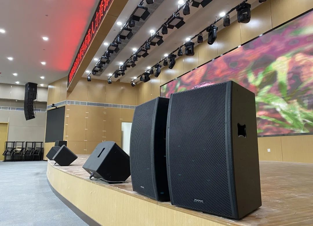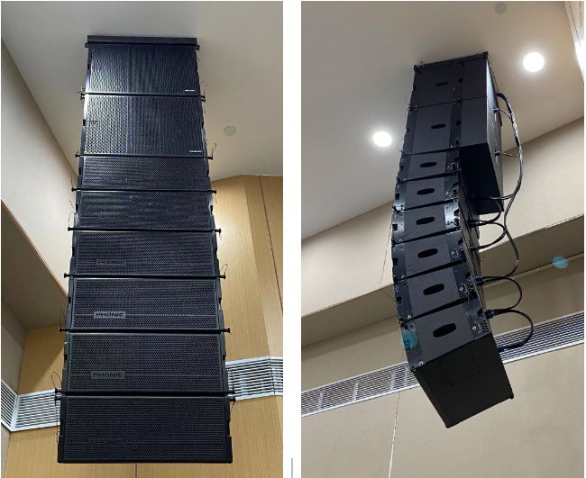 人社局多功能廳音頻擴聲系統,采用美國PHONIC揚聲器,考慮現場實際情況和業主的功能需求,左右主擴各采用6只KT-8八寸三分頻兩驅動線陣列揚聲器,和左右各2只配套吊掛超低KT8SUB,覆蓋全場觀眾席。