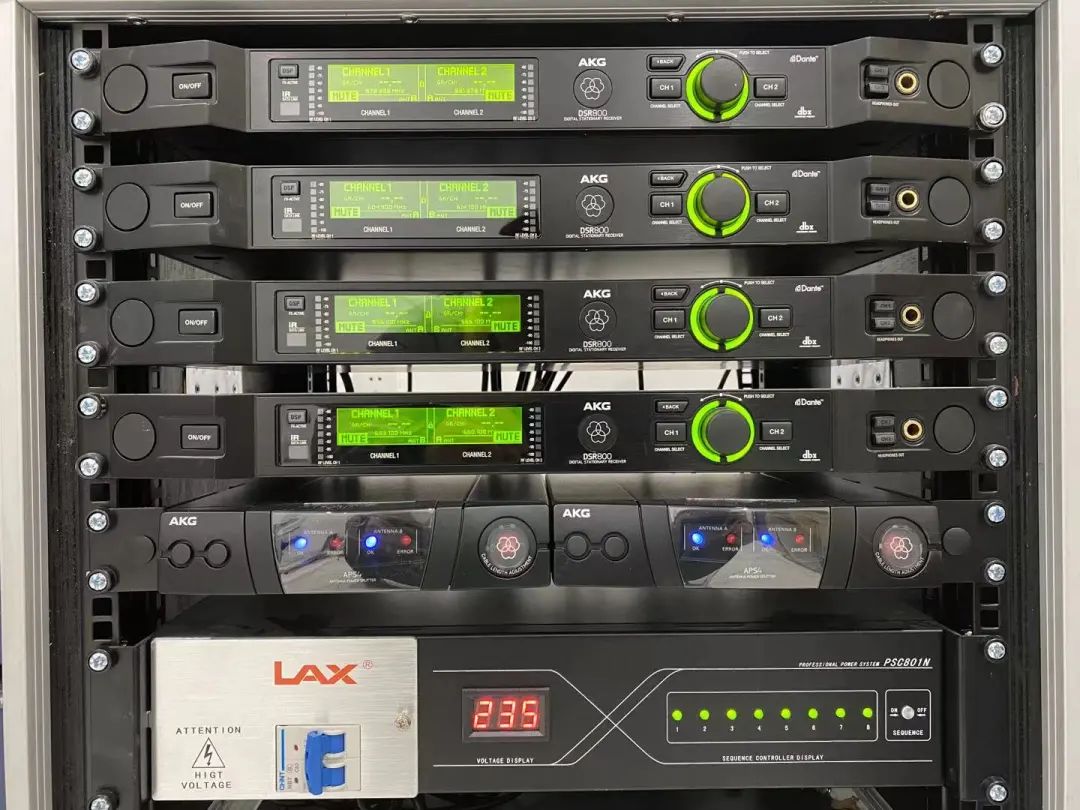 拾音系統上,則由國際著名品牌AKG打造,采用參考級DMS800系列數字無線系統共8個通道,包括4臺DSR800雙通道主機,4支DHT800/D7手持,4個DPT800腰包搭配4個LC82MD領夾麥克風和4個EC82MD耳掛式麥克風,無線話筒腰包領夾一應俱全,系統還使用了APS4天線分配器,外接2個SRA2  B/EW有源指向性UHF天線。