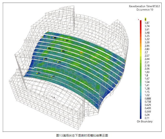 從圖13可以看出,盡管演奏廳內(nèi)少量位置存在混響時(shí)間偏長(zhǎng)的情況,但整體來(lái)看,廳內(nèi)混響時(shí)間分布比較均勻。