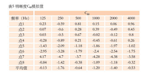 從表5可以看出,各接收點(diǎn)明晰度C80平均值各頻率均在-3 dB~0 dB之間,滿足要求。但是,各接收點(diǎn)明晰度差距較大,其中部分接收點(diǎn)C80不在-3 dB~0 dB范圍內(nèi),這是由于聲聚焦音質(zhì)缺陷造成的。