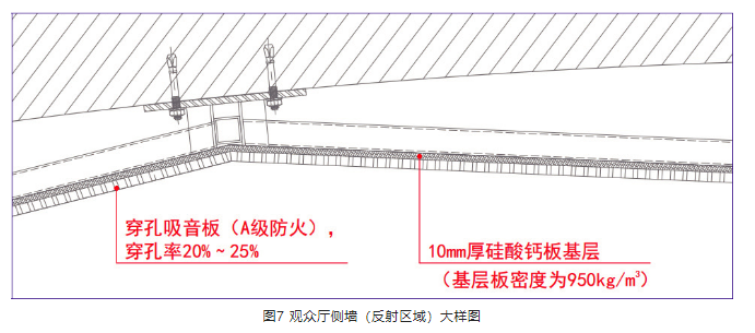 2) 墻面穿孔吸音板背襯基層板,穿孔吸音板與基層板緊貼。既取消了墻面吸聲,又不影響裝飾效果。如圖7、圖8所示。