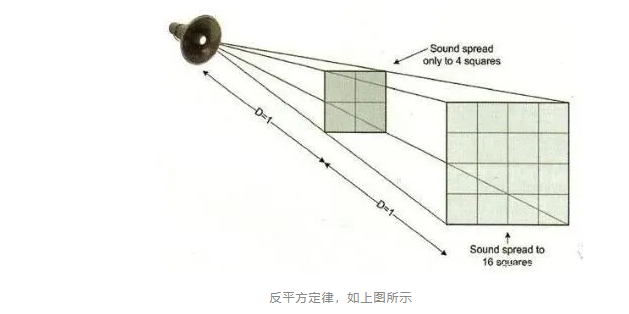 如果距離聲源的距離每增加一倍,那么聲功率就會減少為原來的四分之一,我想這一點很多人都是知道的。這一定律幾乎可以適用于所有的地方,無論是麥克風還是揚聲器陣列。了解這一定律,對于我們確定功率放大器所需的功率十分重要。